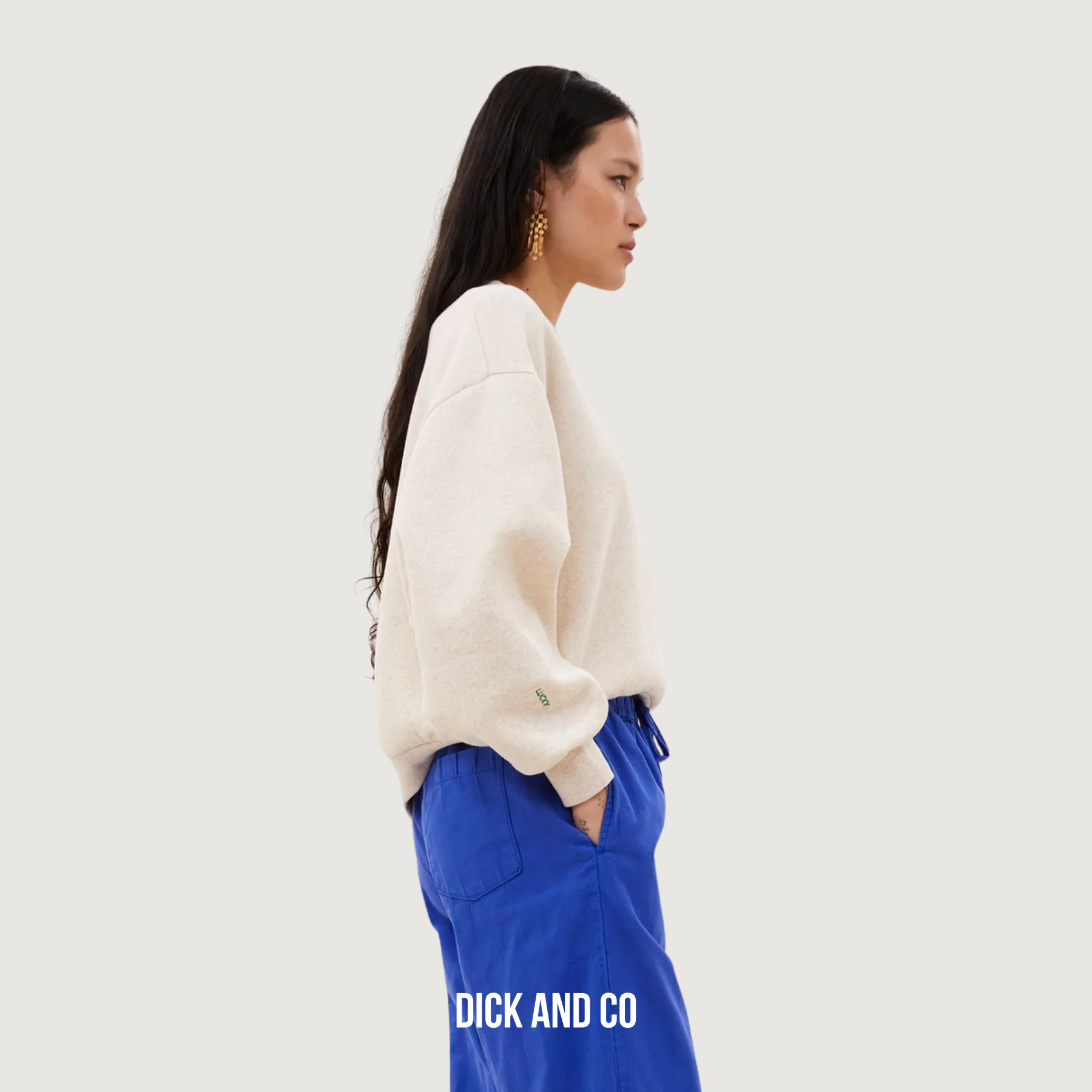 Het model is 174 cm lang en draagt maat S.